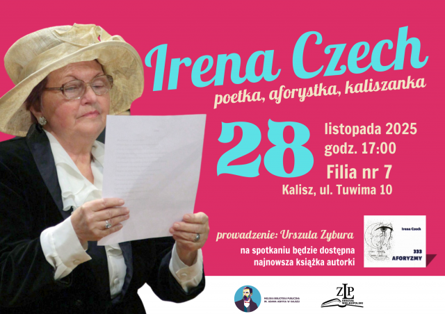 „Irena Czech jest kaliszanką, która od wielu, wielu lat pisze aforyzmy, fraszki i wiersze. Okazją do spotkania jest wydany niedawno tomik „333 aforyzmów” pani Ireny. Oprócz aforyzmów będziemy również czytać jej wiersze, rozmawiać o tym wszystkim, co wyda nam się ważne w ten późnolistopadowy wieczór, który poprowadzi dla państwa Urszula Zybura. Zapraszamy serdecznie” - a zapraszała słuchaczy radiaCENTRUM Izabela Fietkiewicz-Paszek z kaliskiej biblioteki.