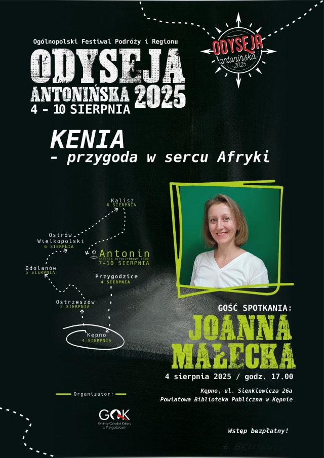 Gościem biblioteki w Przygodzicach będzie Grzegorz Kowalski, mieszkaniec Przygodzic, pasjonat gór, który opowie o swojej miłości do górskich wędrówek. Natomiast biblioteka w Kępnie zaprasza na spotkanie z Joanną Małecką, podróżniczką i pasjonatką Afryki, która zabierze słuchaczy w niesamowitą podróż po Kenii.