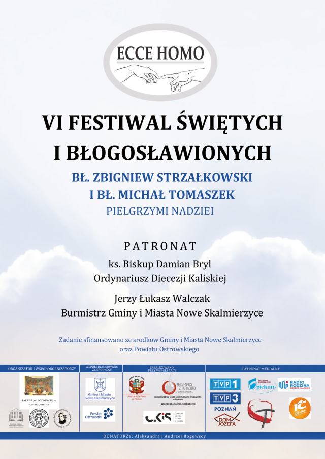Festiwal Świętych i Błogosławionych odbędzie się w tym roku 26 i 27 września. Na wszystkie wydarzenia Festiwalu wstęp jest wolny. Partnerem medialnym wydarzenia jest radioCENTRUM. Parafia pw. Bożego Ciała w Nowych Skalmierzycach, we współpracy z Centrum Kultury i Sztuki w Kaliszu, zaprasza do udziału w VI Festiwalu Świętych i Błogosławionych Ecce Homo.