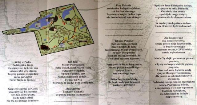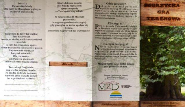 "Kiedy dotrzesz do celu młody przyjacielu, ujrzysz nagrodę", po którą trzeba wejść do pałacu, oczywiście ze słowami wpisanymi w wolnych miejscach na ulotce. Dostaniesz też pieczątkę, która jest świadectwem przejścia trasy Dobrzyckiej gry terenowej. Zabawa jest przednia dla indywidualnych spacerowiczów ale i dla rodzin. W tym przypadku można zrobić współzawodnictwo, kto uważniej spaceruje po parku, rodzice czy dzieci.