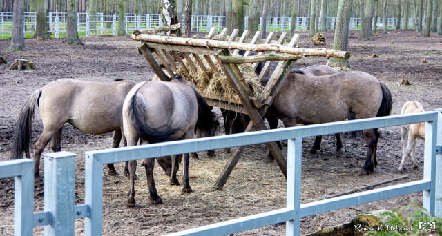 Koniki polskie przyjechały do Gołuchowa w 2000 roku z Roztoczańskiego Parku Narodowego. Aktualnie jest ich 9 - ogier Kacper, klacze Ostróżka, Hebe, Karina i Nawłoć oraz cztery źrebaki, w tym dwa urodzone w ubiegłym roku i dwie klaczki, które przyszły na świat kilka tygodni temu. Koniki polskie to potomkowie dzikich tarpanów, które wyginęły, ale udało się odtworzyć ich rasę. Są długowieczne, odporne na choroby i trudne warunki życia. W Gołuchowie są zadbane - jedzą siano, i podobnie jak żubry zgniecione mieszanki zbożowe oraz marchewkę.