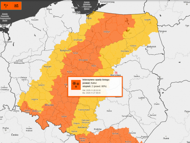 Instytut Meteorologii i Gospodarki Wodnej wydał dla Południowej Wielkopolski ostrzeżenie drugiego stopnia o intensywnych opadach śniegu. Zgodnie z przewidywaniami, padać zacznie w nocy z wtorku na środę.