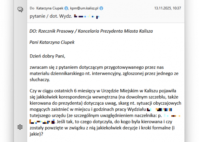 rc.fm / tel. 62. 503 11 99) zadaliśmy pytania o mocno nieobyczajne zdarzenie w jednym z wydziałów kaliskiego ratusza, do którego całkiem niedawno miało prawdopodobnie dojść w służbowym gabinecie w godzinach pracy. W rolach głównych – wg informatora - wystąpić mieli naczelnik jednego z najważniejszych wydziałów i pracownica urzędu.