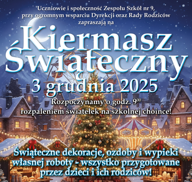 Taki jarmark to okazja, by kupić świąteczne upominki, ozdoby i słodkości, a przy okazji wspomóc szkołę w tworzeniu miejsca wypoczynku dla uczniów - Zespół Szkół nr 9 w Kaliszu zaprasza na Kiermasz Świąteczny organizowany przez uczniów, rodziców, radę rodziców, dyrekcję oraz grono pedagogiczne. W czasie wydarzenia będzie można kupić świąteczne dekoracje, ozdoby domowe wypieki i słodkości, drobne upominki przygotowane przez uczniów i rodziców.