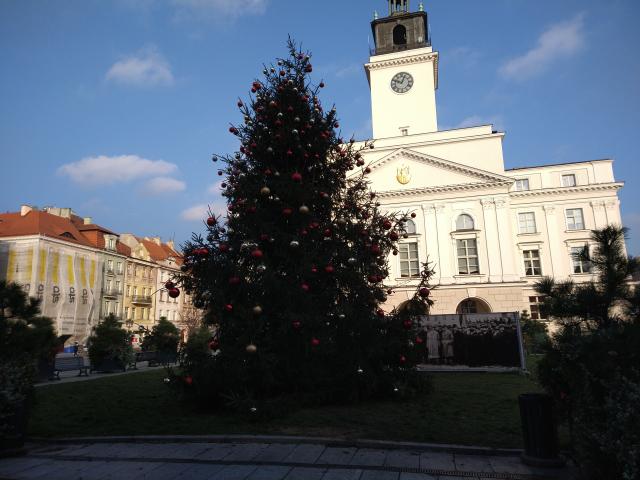 Udekorowany ozdobami świątecznymi świerk pojawił się przy kaliskim ratuszu. Ponad 10-metrowe drzewo przyjechało z Nadleśnictwa Antonin.