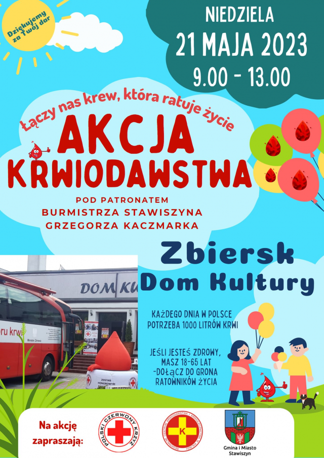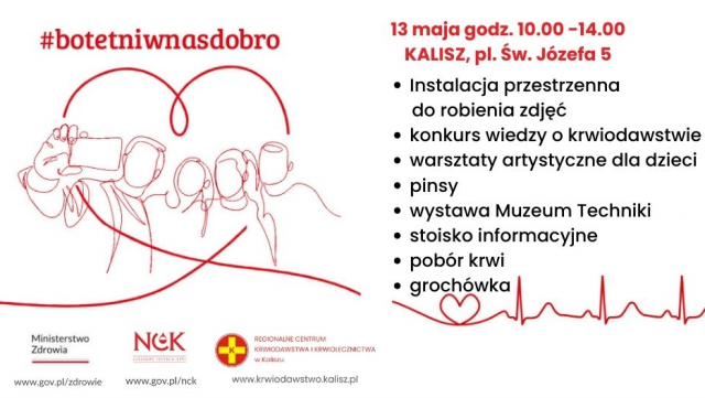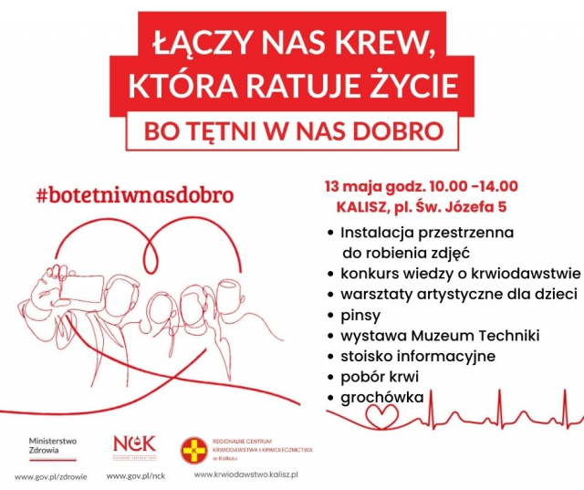 Dwie różne daty i dwa różne miejsca. Jeden wspólny mianownik - zbiórka krwi. Wydarzenie "Bo tętni w nas dobro" odbędzie się w tę sobotę 13 maja, na placu przed starostwem powiatowym w Kaliszu. Natomiast akcję w gminie Stawiszyn zaplanowano na 21 maja, w Domu Kultury w Zbiersku. A o tym, jak ważne jest oddawanie krwi, powiedział radiuCENTRUM Janusz Sibiński, z kaliskiego oddziału Polskiego Czerwonego Krzyża, propagator idei krwiodawstwa.