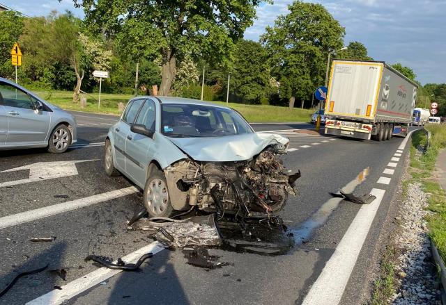 Siła uderzenia była duża, bo Peugeot wypadł z drogi. Na miejscu pracowały służby ratunkowe. Ruch na drodze odbywał się wahadłowo.