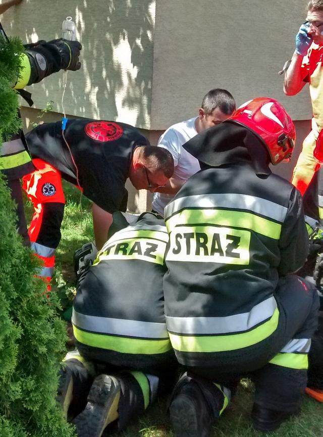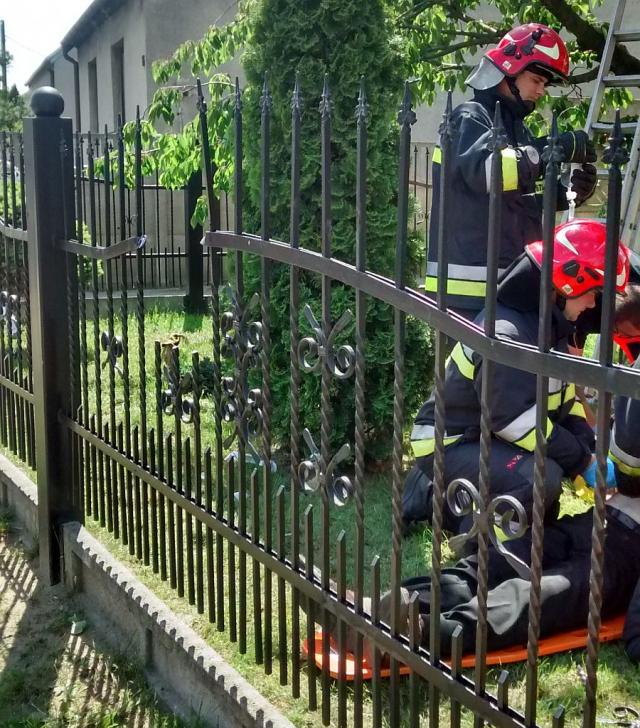 Tym razem mężczyzna spadł na metalowy płot z wysokości. Poszkodowany zwisł na ogrodzeniu, a jeden z prętów przebił jego ciało. Aby uwolnić poważnie rannego mężczyznę, strażacy, za pomocą hydraulicznego sprzętu wycięli fragment ogrodzenia, wraz z elementami, które wbiły się w ciało poszkodowanego.