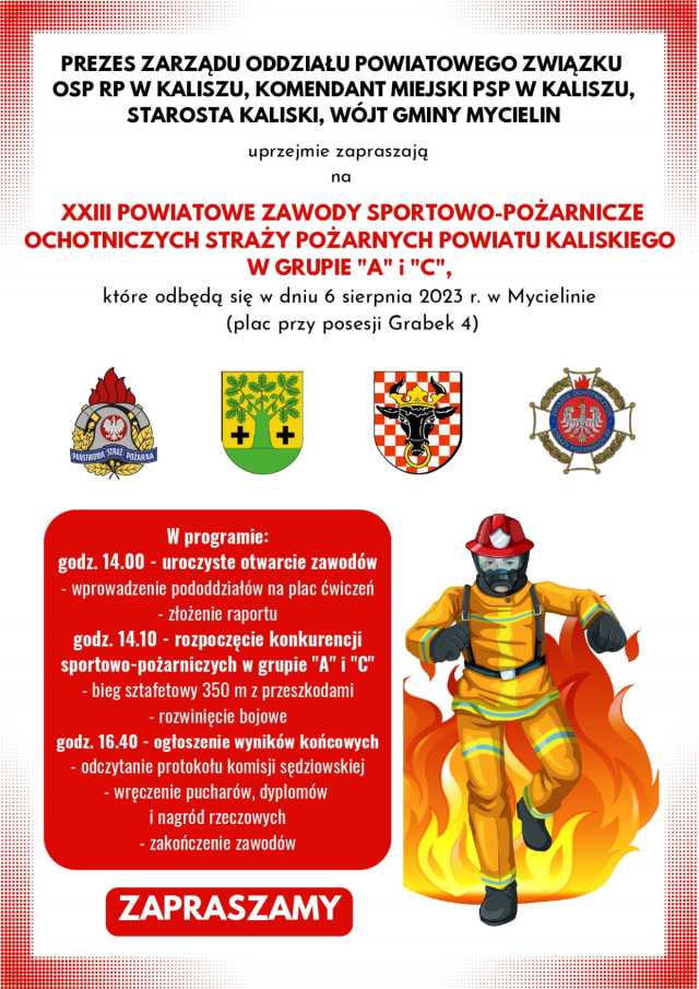 Organizatorami zawodów są: oddział powiatowy ZOSP RP w Kaliszu, PSP w Kaliszu, starostwo kaliskie oraz gmina Mycielin.
