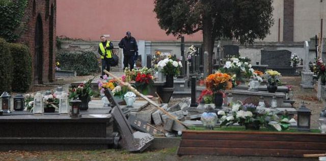 Za znieważenie spoczynku zmarłych przez zniszczenie nagrobków o szczególnym znaczeniu dla kultury grozi kara do 10 lat więzienia. Policja ustala wielkość strat.