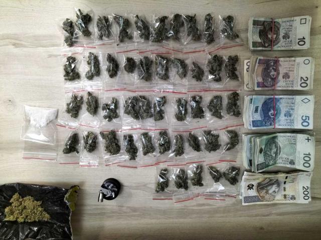 "Podczas gdy policjanci wykonywali swoje rutynowe czynności, mieszkaniec gm. Kobyla Góra zachowywał się bardzo nerwowo. Z uwagi na powyższe osoby poproszono o wyjście z samochodu, a następnie poddano je kontroli osobistej, której wynik okazał się imponujący. 19-latek posiadał przy sobie pieniądze w kwocie ponad 10 000 złotych, 45 woreczków strunowych z zawartością suszu roślinnego koloru brunatnego oraz woreczek strunowy z zawartością białego, zbrylonego proszku. Ponadto mężczyzna posiadał przy sobie młynek, wagę elektroniczną oraz puste woreczki strunowe. Na miejsce skierowano także policjantów z Wydziału Kryminalnego, którzy wraz z 17-letnią pasażerką udali się do miejsca zamieszkania zatrzymanych do kontroli osób celem wykonania przeszukania. W zajmowanych przez nich pomieszczeniach ujawniono trzy sadzonki konopi oraz woreczek strunowy z zawartością białego proszku. Kobietę zatrzymano i doprowadzono do Komendy Powiatowej Policji w Ostrzeszowie, gdzie podczas czynności przeszukania osoby ujawniono przy niej woreczek strunowy z zawartością suszu roślinnego koloru brunatnego" - przekazała st. asp. Magdalena Hańdziuk, oficer prasowa ostrzeszowskiej policji.