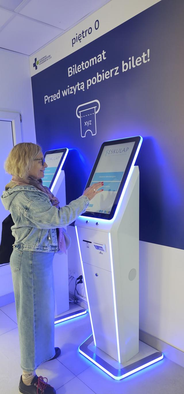 Tuż za drzwiami wejściowymi do szpitala znajdują się dwa automaty. Wystarczy wybrać jeden z nich, wpisać numer PESEL lub zeskanować dowód osobisty, aby otrzymać bilet z numerem kolejki – do rejestracji ogólnej, do izby przyjęć na szpitalny oddział, do laboratorium na badanie bądź po wynik i na razie do jednej z trzech poradni - chirurgicznej, urologicznej, chirurgii dziecięcej. Wszystko jest intuicyjne. Po zajęciu miejsca na kanapach w nowej poczekalni, pacjent obserwuje ekrany multimedialne, na których wyświetlają się aktualnie obsługiwane numery i słucha komunikatu głosowego, kiedy i do którego stanowiska ma podejść.