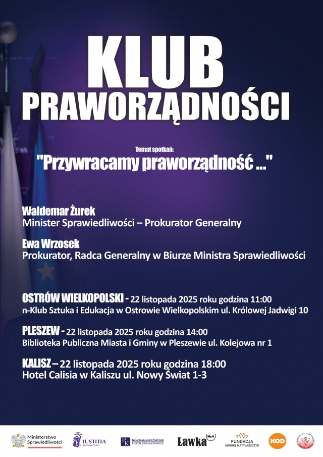 Gośćmi wydarzeń będą - minister sprawiedliwości i prokurator generalny Waldemar Żurek oraz prokurator i radca generalny w Biurze Ministra Sprawiedliwości - Ewa Wrzosek. O godzinie 11:00 spotkanie odbędzie się w Ostrowie Wlkp. w Klubie Sztuka i Edukacja, o 14:00 w Bibliotece Publicznej Miasta i Gminy Pleszew, a o 18:00 w kaliskim Hotelu Calisia. Uczestnicy spotkań pod hasłem Kluby Praworządności „Przywracamy praworządność” będą mogli porozmawiać o aktualnej sytuacji wymiaru sprawiedliwości w Polsce, planowanych zmianach oraz o tym, jak w praktyce przywracane są rządy prawa. Kluby Praworządności, działające w ramach projektu Stowarzyszenia Sędziów Polskich IUSTITIA „Rządy Prawa – Wspólna Sprawa”, mają charakter edukacyjny. – To nie polityka, lecz rozmowa o wartościach, które budują demokratyczne państwo prawa – podkreśla sędzia Krzysztof Urbaniak, współinicjator powstania klubu w Pleszewie. Warto przypomnieć, że Ewa Wrzosek gościła w Pleszewie w kwietniu 2023 roku. Natomiast Waldemar Żurek, wraz z innymi sędziami szykanowanymi przez władze - Igorem Tuleją, Pawłem Juszczyszynem był w Pleszewie we wrześniu roku 2022.