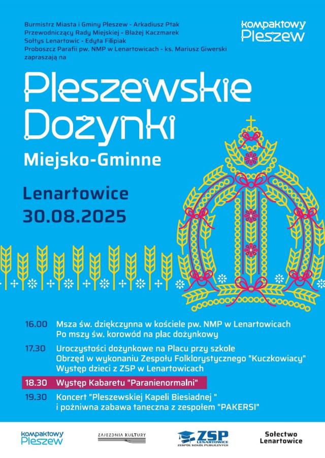 Pleszewskie Dożynki Miejsko -Gminne 2025 zaplanowano na ostatnią sobotę sierpnia. Święto plonów odbędzie się w Lenartowicach, starostami dożynek po raz pierwszy będą małżonkowie. Gwiazdą wieczoru będzie kabaret Paranienormalni.