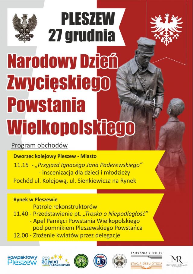 Uroczystości rozpoczną się w poniedziałek 27 grudnia po godzinie 11:00 na pleszewskim dworcu, gdzie z pociągu przemówi do zebranych uczeń Szkoły Podstawowej nr 3 im. Powstańców Wielkopolskich, wcielający się w Ignacego Jana Paderewskiego, któremu towarzyszyć będzie żona. Po przemówieniu, zebrani na dworcu uczniowie Trójki odśpiewają Marsyliankę i Rotę, po czym stara limuzyna z Paderewskimi ruszy w kierunku Rynku w towarzystwie uczniów i mieszkańców miasta ku Rynkowi, gdzie przy pomniku powstańca, uczniowie Technikum Rolniczego w Marszewie, które nosi imię Pułk. Ludwika Bociańskiego - jednego z przywódców powstania w Pleszewie, zaprezentują inscenizację. Wynikać z niej będzie bardzo aktualne przesłanie, że "wolna Polska jest zadaniem i trzeba o nią wciąż walczyć".
