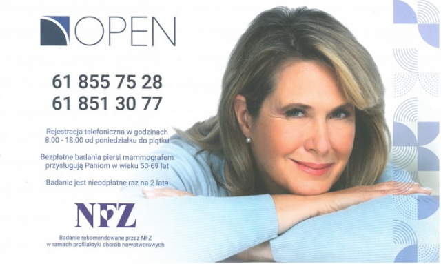 Wykonawcą bezpłatnego badania piersi jest Ośrodek Profilaktyki i i Epidemiologii Nowotworów im. Aliny Pieńkowskiej w Poznaniu. Program badań mammograficznych jest realizowany ze środków Europejskiego Funduszu Społecznego w ramach projektu "Rozwój profilaktyki onkologicznej wśród kobiet realizowany przez OPEN SA na terenie całej Wielkopolski w latach 2019-2023".