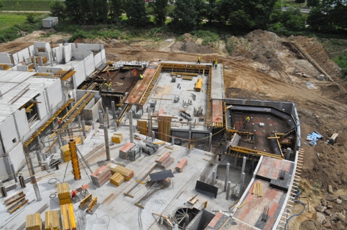 Gotowe są już niecki do wewnętrznej zjeżdżalni w głównym budynku oraz podposadzkowa kanalizacja. Teraz fachowcy pracują przy stropach drugiej kondygnacji, stawiane są też słupy, które będą podtrzymywały dach obiektu. Ekipa elektryków pracuje nad budową instalacji oświetleniowej i zasilaniem.
