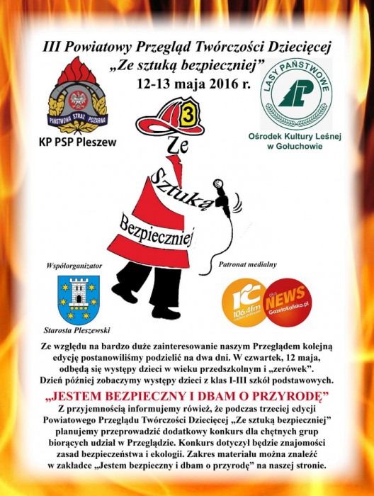 Komenda Powiatowa Państwowej Straży Pożarnej w Pleszewie oraz Ośrodek Kultury Leśnej w Gołuchowie zapraszają do udziału w III Powiatowym Przeglądzie Twórczości Dziecięcej "Ze sztuką bezpieczniej"'. Partnerem medialnym imprezy zaplanowanej na 12 i 13 maja jest Radio Centrum.