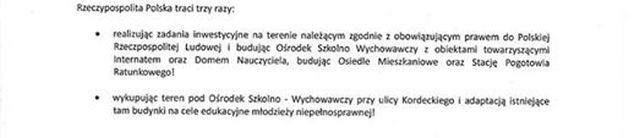 "Skoro to są mediacje, nie wypada mi tego komentować. Nie ukrywam, że jesteśmy zaszokowani stanowiskiem władz Kalisza, wyraźnie zmienionym pod wpływem środowisk skrajnych. Wcześniejsze ustalenia mówiły, że zachowane zostaną bloki mieszkalne, internat, natomiast rozebrana zostanie szkoła (ośrodek szkolno-wychowawczy). Zresztą została już przeniesiona wielkim kosztem nakładów pieniędzy. Miało nam przypaść boisko i wzgórze, gdzie chcieliśmy zrobić miejsce pamięci. Natomiast władze miejskie w tej chwili chcą przywrócić działalność edukacyjną w bydunku po przeniesionej szkole".