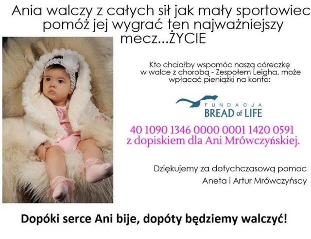 "Chcemy wszystkim serdecznie podziękować. Każdego dnia Ania daje nam sygnał że ta walka na sens, maleńka kruszynka wykonuje czasem wysiłek ponad swoje możliwości by pokonywać trudności na jakie napotyka każdego dnia. Walczy dzielnie jak mały sportowiec o swoje życie i ta walka z Wami jest łatwiejsza"- powiedziała Radiu Centrum mama dziewczynki, Aneta Mrówczyńska.