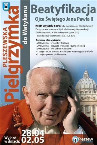 Kiedy ogłoszono termin beatyfikacji chętnych na wyjazd do Watykanu było wielu. Władze Pleszewa planowały wynajęcie 70 - osobowego autobusu a także dopłaty do przejazdu dla osób zameldowanych w mieście i gminie. W sumie miało to być 15 000 zł z kasy miejskiej. Program pielgrzymki jest prosty: jeden nocleg w drodze do Rzymu, udział w uroczystościach na Placu sw. Piotra i powrót do Pleszewa już bez noclegu. Wizja kilkudziesięciu godzin spędzonych w autobusie plus informacje płynące ze srebrnego ekranu, że w Rzymie będzie drogo, ciężko i gorąco, spowodowały, że lista chętnych maleje. Skreślają się nawet ci, którzy byli pewniakami. A wybierały się do Rzymu głównie osoby w starszym wieku. Rzecznik ratusza Marcin Konieczny powiedział Radiu Centrum, że jeśli liczba chętnych spadnie poniżej 25 osób, pielgrzymka może być odwołana. Przypomnijmy, że Janowi Pawłowi II w 2004 roku pleszewianie wręczyli dyplom Honorowego Mieszkańca Miasta i Gminy. A Pleszew jest miastem papieskim.