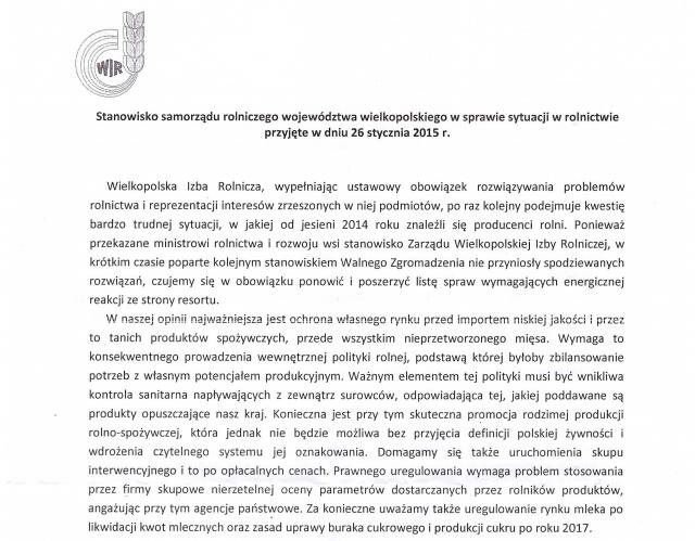 W poniedziałek Wielkopolska Izba Rolnicza opracowała swoje stanowisko dotyczące trudnej sytuacji w rolnictwie. We wtorek w każdym powiecie w Wielkopolsce zostały wręczone starostom. "Chcemy żeby zostało poparte przez poszczególne samorządy terytorialne i rady" - dodał Mieczysław Łuczak. W Kaliszu stanowisko rolników zostało też wręczone kierownikowi delegatury Urzędu Wojewódzkiego, tak żeby trafiło do wojewody i dalej do ministra.