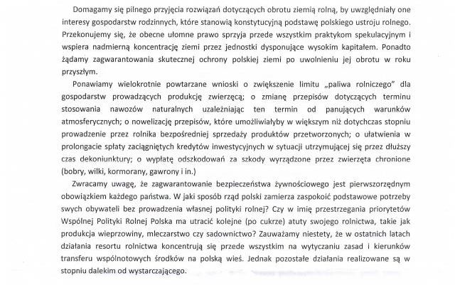 W swoim stanowisku rolnicy wymieniają kilka ważnych dla nich roszczeń. M.in. domagają się uruchomienia skupu interwencyjnego i to po cenach opłacalnych. Za konieczne uważają też uregulowanie rynku mleka po likwidacji kwot mlecznych oraz zasad uprawy buraka cukrowego i produkcji cukru po roku 2017.