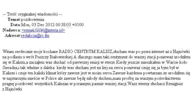Witam serdecznie moje kochane RADIO CENTRUM, słucham was po przez internet aż z Hajnówki na podlasiu u wrót Puszczy Białowieskiej. A dlaczego mam taki sentyment do waszej stacji ponieważ urodziłem się w Kaliszu, a zacząłem was słuchać od pierwszej emisji w eterze. Kiedy jeszcze mieszkałem w Warcie koło Sieradza,i tak właśnie z daleka kiedy was słucham jest mi lżej na sercu ponieważ czuję się ja bym był w Kaliszu i czuje ten kaliski klimat który zawsze jest w moim sercu. Zawsze każdemu powtarzam że urodziłem się w najstarszym mieście w Polsce ale zawsze będę młody duchem,mam prośbę za waszym pośrednictwem pragnę pozdrowić wszystkich Kaliszan w porannym pasmie waszej stacji.Wasz wierny słuchacz Remigiusz z Hajnówki