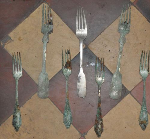 Póki co ze zdjęć wynika że to jest zwykłe badziewie. Chociać te nie zardzewiałe mogą być ze srebra więc te przedmioty mogą posiadać wartość materialną a nie historyczną. Ze zdjęć ciężko ocenić.