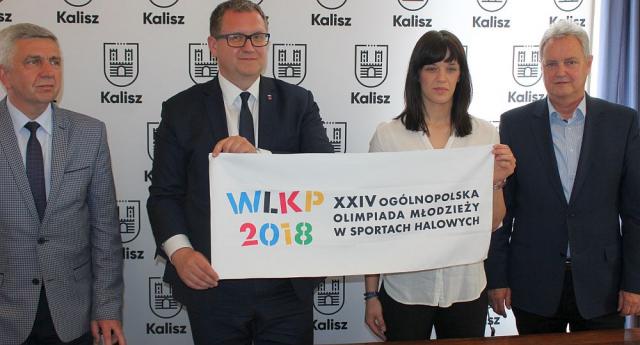 na fot. od lewej: Tomasz Rogoziński / wiceprezydent Kalisza, Grzegorz Sapiński / prezydent Kalisza, Hanna Łukasiewicz / kapitan drużyny Energa MKS Kalisz, Mirosław Dębowski / Kaliski Szkolny Związek Sportowy