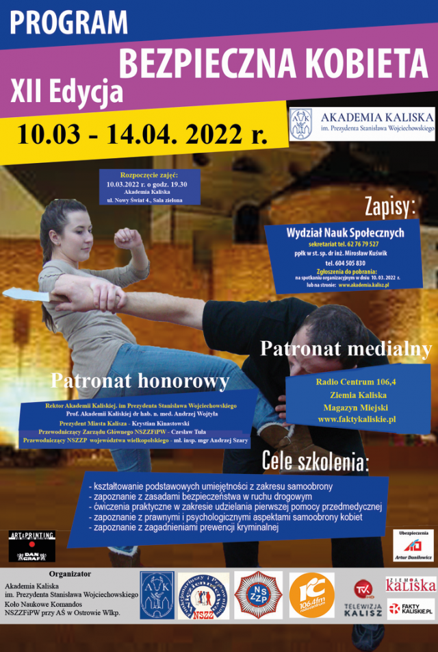 Rusza XII edycja programu Bezpieczna Kobieta organizowanego przez Akademię Kaliską we współpracy z służbami mundurowymi. Zajęcia dedykowane są kobietom w wieku od 16 lat, które nie tylko chcą poznać podstawy samoobrony, ale też popracować nad kondycją fizyczną.